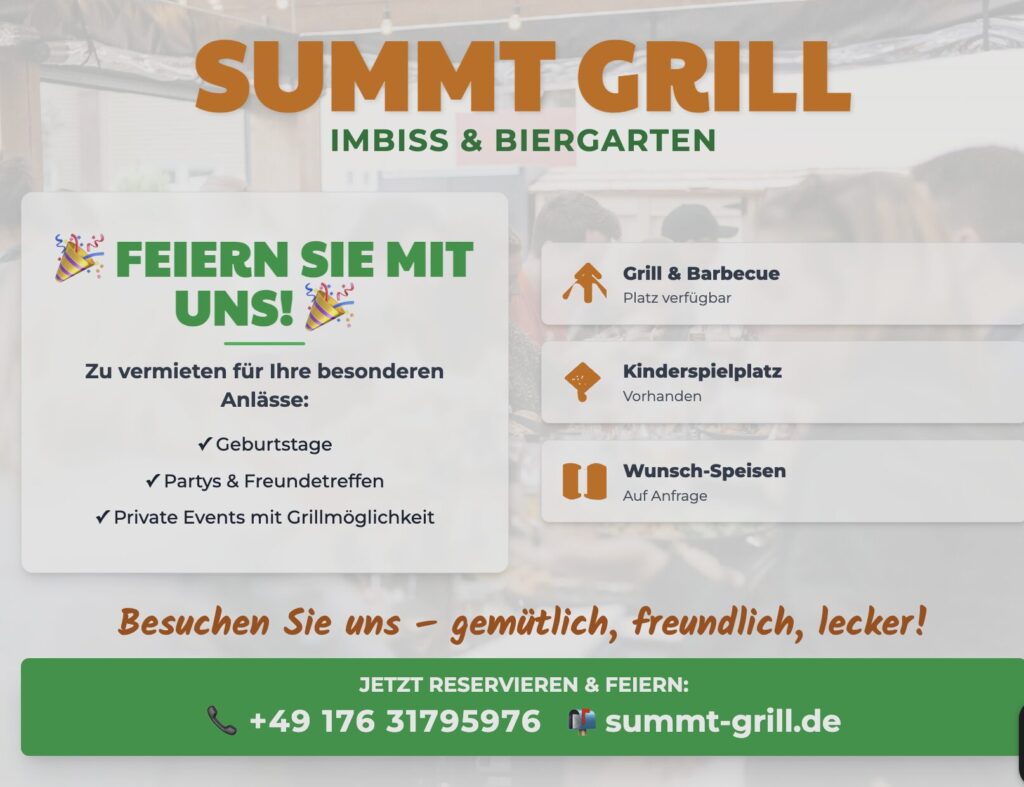 Ob Partys, Geburtstage, Familienfeste oder U.v.m. – im Summt Grill finden Sie die perfekte Kulisse für Ihre besonderen Anlässe. Genießen Sie authentische Aromen und erfrischende Biere, während wir Ihre Feier mit großartigem Essen, lebhaften Biergarten-Flair und unseren vielfältigen Speisen zu einem unvergesslichen Erlebnis machen. Begleiten Sie uns und feiern Sie mit uns in gemütlicher Atmosphäre!